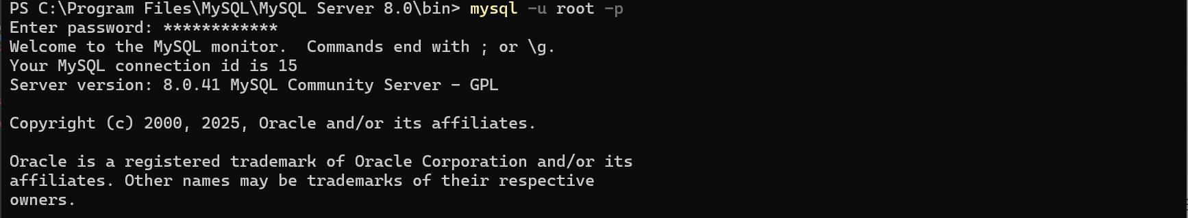 우선 MySQL Server가 저장되어 있는 경로로 접속한 후, mysql -u root -p를 입력하면 root 비밀번호를 입력하게 된다.