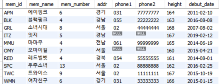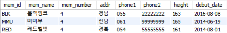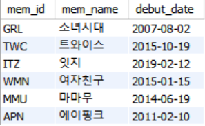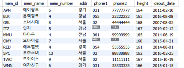 INSERT INTO member VALUES('TWC', '트와이스', 9, '서울', '02', '11111111', 167, '2015.10.19');