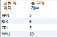 SUM() 함수로 구매한 개수를 합치면 위와 같은 출력값이 나온다.