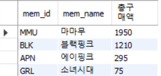 SELECT M.mem_id, M.mem_name, SUM(price * amount) '총구매액',