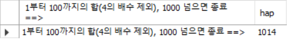 SELECT '1부터 100까지의 합(4의 배수 제외), 1000 넘으면 종료 ==>',hap;