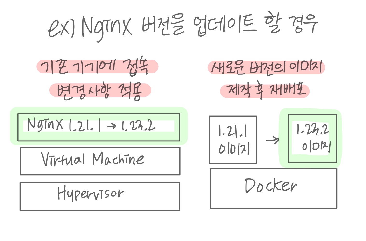* 컨테이너의 이미지는 한번 지정된 후 변경되지 않는다 -> 새로운 설정이나 패치가 필요할 경우 새로운 이미지를 만들어야 함
