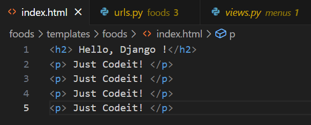 foods > views.py 에 있는 index 함수에 아래와 같이 여러 개의 html 코드들을 나열한다면