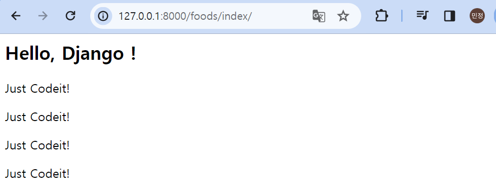-> views.index 를 실행 (= foods app 안에 있는 views 파일을 확인)